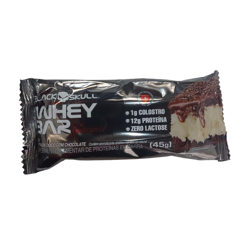 Whey Bar Gourmet (45g)       A WHEY BAR GOURMET® chegou para revolucionar o mercado de barras de proteína. Sua formulação foi desenvolvida com um blend de proteínas que possuem velocidades de absorção/digestão distintas visando o aumento da disponibilidade de aminoácidos na corrente sanguínea de forma prolongada. Desta maneira, o processo de síntese proteica é estendido e a recuperação muscular otimizada.     Mais do mesmo? Com a BLACKSKULL USA nunca! Além dos benefícios citados anteriormente, a WHEY BAR GOURMET® é a única barra de proteína com colostro bovino em sua composição. O colostro é composto por uma poderosa combinação de bioativos (imunoglobulinas, moduladores imunológicos e oligossacarídeos) que apoiam a saúde imunológica, respiratória e a saúde intestinal. Além dos bioativos, o colostro bovino possui em sua composição fatores de crescimento como o IGF1 essa combinação de ativos favorece a proliferação e a restituição celular, bem como a síntese de proteínas e o reparo de tecidos moles.     Tudo isso com sabores extraordinários de sobremesa como torta de limão e brownie de chocolate, ganache de chocolate branco, cookiesecream e muito mais. Vale ressaltar que a WHEY BAR GOURMET® é zero lactose, possibilitando seu consumo por intolerantes, e apenas 6% do valor diário recomendado de carboidratos.  Benefícios: - 12 gramas de proteína;- 1g de colostro;- Zero Lactose;- Auxilia na recuperação muscular;- Prática e saudável;- Baixo sódio;- Saborosa.