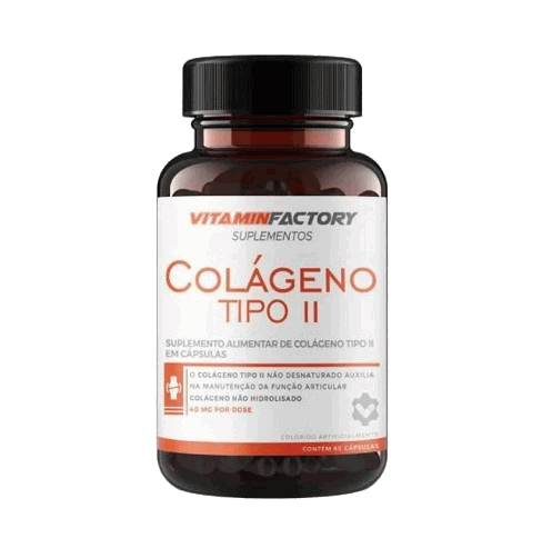 Colágeno Tipo II (60 caps)O colágeno tipo II é uma proteína produzida em laboratório a partir das fibras de colágeno da cartilagem e ossos de frangos e bovinos. É amplamente utilizado na prevenção e tratamento de doenças articulares. É mito acreditar que apenas pessoas idosas necessitem fazer a suplementação com esse tipo de colágeno. Algumas atividades físicas de alta intensidade como corrida e crossfit podem causar lesões articulares e como medida preventiva, pessoas cada vez mais jovens, também consomem colágeno do tipo II. Pessoas obesas que tem suas articulações e cartilagens comprometidas pelo excesso de peso também se beneficiam com o consumo regular de colágeno tipo II. Devido ao excesso de carga depositado sobre quadril, joelhos e tornozelos, essas articulações podem sofrer com o desgaste precoce.Auxilia no tratamento e na prevenção de artrite e artrose;Repositor natural de colágeno;Estimula a reconstrução de cartilagens, discos e articulações;Possui ação antiinflamatória, reduzindo a dor articular;Auxilia no tratamento e na prevenção de lesões;Melhora a saúde das juntas;Contribui para ossos e músculos mais resistentes;Alivia dores articulares;Melhora a mobilidade e a flexibilidade.