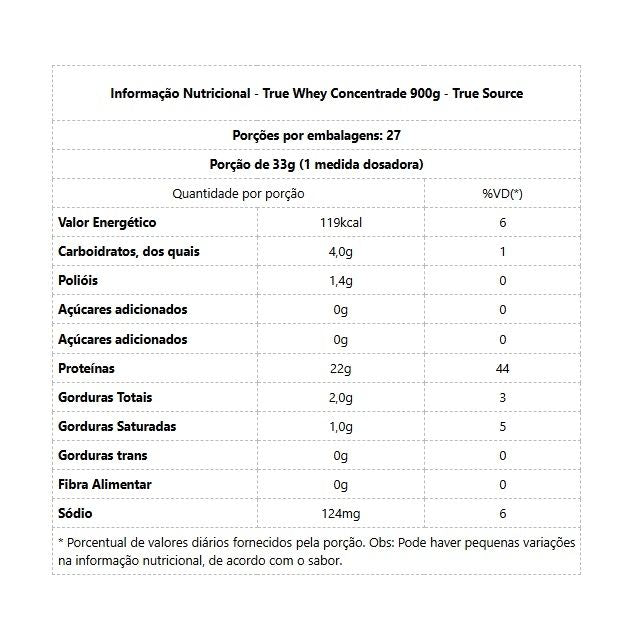 True Whey Concentrate (900g)        WHEY NATURAL, SABOROSO E ZERO LACTOSE!      A mais pura e nutritiva das proteínas, agora na versão concentrada e livre de lactose, assim podemos definir a TRUE CONCENTRATE.      Uma proteína limpa, leve, com colágeno Verisol e os mais puros ingredientes, pois a True é assim, pura, natural e limpa.      A TRUE CONCENTRATE, onde o leite é extraído de vacas criadas soltas, livre de rações transgênica e com qualquer tipo de hormônios e antibióticos. Além disso você estará consumindo uma proteína que preserva compostos bioativos como a lactoferrina e imunoglobulinas essenciais para saúde e imunidade.      Disponível em vários sabores, nossa proteína tem um sabor inigualável com uma cremosidade única, deixando você sempre com um sabor de quero mais.      Adoçamos as nossas proteínas com adoçantes naturais e não usamos aromatizantes ou corantes artificiais. Natural para que você possa aproveitar o que existe de melhor na natureza.      Assim é a nossa TRUE CONCENTRATE, nutritiva, limpa, natural e deliciosa.     True Concentrate sabor Coconut Icecream, o mais queridinho de todos! O coco é uma iguaria muito apreciada pelos brasileiros. Seja de forma natural ou em receitas, é inegável que o sabor atraente combina com diversas ocasiões.   Benefícios: - 22g de proteínas;- Fonte de BCAA’s;- Zero lactose;- Adoçantes Naturais;- Possui Colágeno;- Volume muscular;- Manutenção da massa magra;- Produzido em ecossistema que promove o bem estar animal;- Fortalece a imunidade;