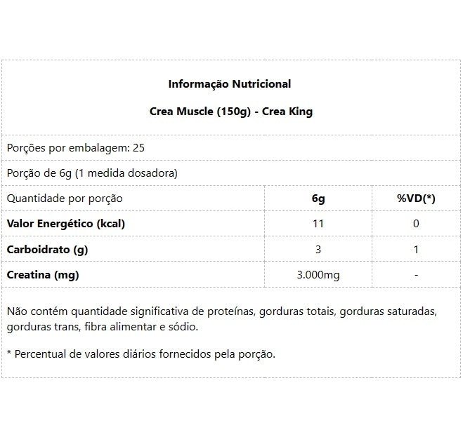 Crea Muscle (150g) - Crea King A creatina é a chave para força, resistência e recuperação aprimoradas, sendo um suplemento popular entre atletas e entusiastas do fitness, e por boas razões. Este composto natural, encontrado no corpo e em alimentos como carne vermelha e peixe, oferece uma série de benefícios significativos para o desempenho esportivo e a saúde em geral, tais como: * Aumento da força e potência muscular;* Ganho de massa muscular;* Melhora a performance dos treinos;* Melhoria do desempenho de alta intensidade* Recuperação mais rápida;* Revigora as fontes de energia;* Melhoria cognitiva;* Evita fadiga muscular. A Crea Muscle, visando uma melhor absorção, possui em sua composição a Maltodextrina, carboidrato complexo. A Maltodextrina é um carboidrato de rápida absorção. Isso significa que ela é digerida e absorvida rapidamente pelo corpo. A creatina é um composto que é absorvido de maneira mais lenta pelo corpo, portanto a Maltodextrina pode ajudar a acelerar a absorção e aumentar os níveis de creatina no corpo. A Maltodextrina aumenta os níveis de insulina no corpo. A insulina é um hormônio que ajuda o corpo a absorver glicose e creatina, portanto a Maltodextrina ajuda a aumentar os níveis de insulina no corpo e melhorar a absorção de creatina. A Crea King é uma marca focada em Creatinas, sendo que todos os seus produtos possuem Creatina na composição. Nossa missão é ajudá-lo a conquistar seus objetivos proporcionando mais força e desempenho através da ingestão de Creatina.