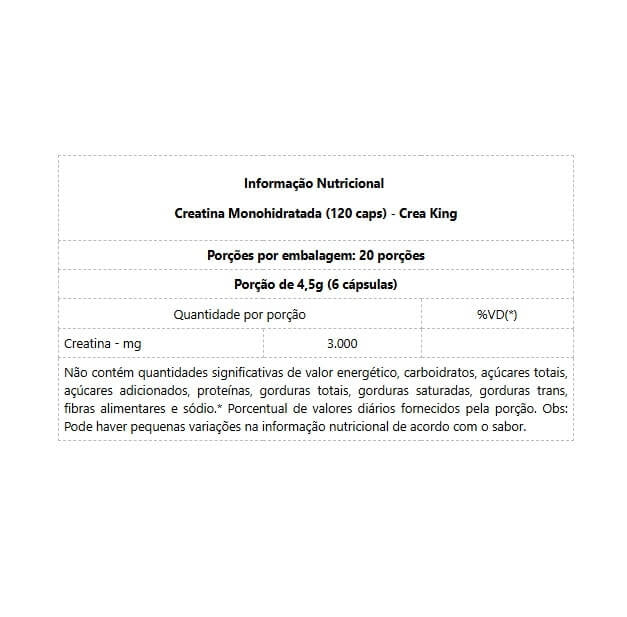Creatina Monohidratada (120 caps) Creatina Monohidratada 120 Cápsulas da Crea King oferece praticidade e potência para quem busca uma suplementação eficiente para aumentar a força, a explosão muscular e o desempenho nos treinos. Em um formato fácil de consumir, esta creatina em cápsulas é ideal para incluir no dia a dia, garantindo a dose ideal sem necessidade de misturas. Benefícios da Creatina Monohidratada: Aumento de força e potência: A creatina é um dos suplementos mais comprovados para a melhora de desempenho em atividades de alta intensidade, contribuindo para uma regeneração mais rápida de energia (ATP).Ganho de massa muscular: Suporte ao aumento de volume muscular, ideal para quem busca hipertrofia e melhor desempenho.Praticidade em cápsulas: O formato em cápsulas facilita o consumo e a dosagem, ideal para quem tem uma rotina agitada.