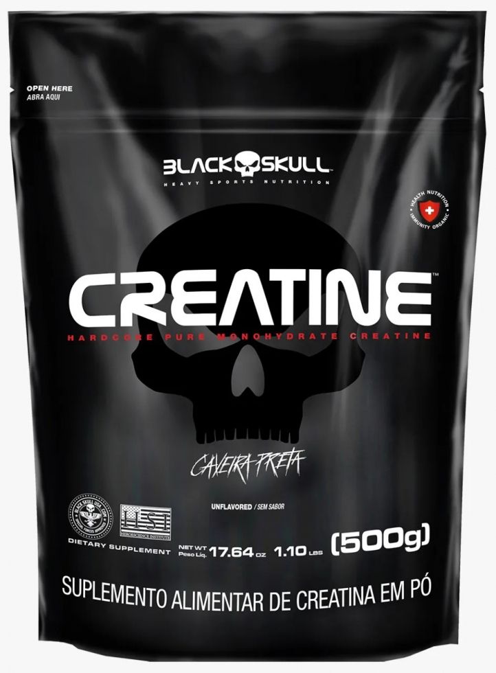 Creatine (500g)       A creatina é um composto natural produzido pelo corpo e encontrado em carnes e peixes, armazenado principalmente nas fibras musculares. Ela desempenha um papel crucial ao fornecer energia para as células musculares durante exercícios de resistência e atividades de alta intensidade.      A creatina monoidratada, um dos ativos mais amplamente estudados pela ciência recentemente, oferece benefícios não apenas para atletas, mas também para a saúde em geral. Além de melhorar o desempenho esportivo, demonstrou ter propriedades anti-inflamatórias, contribuindo para uma melhor saúde global. Além disso, atua como um neuroprotetor, reduzindo a demanda cerebral por oxigênio e, assim, melhorando o desempenho cognitivo.      A CREATINE™ da BLACKSKULL USA™ é um produto de alta qualidade composto exclusivamente por creatina monoidratada. Ela é projetada para proporcionar energia adicional, melhorando o desempenho físico durante exercícios de curta duração e alta intensidade, o que pode favorecer o crescimento muscular e o aumento da resistência física.   Benefícios: * Maior força e explosão durante os treinos; * Aumenta significativamente a energia muscular; * Acelera a Hipertrofia Muscular; * Estimula a hidratação muscular.