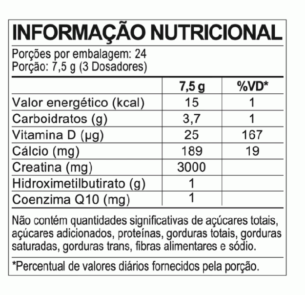 Creatina Senior Pro – Força e Vitalidade Após os 50 Desenvolvida para homens e mulheres acima de 50 anos, a Creatina Senior Pro combina Creatina Monohidratada com ingredientes que auxiliam no ganho e manutenção da massa muscular, promovendo força, energia e imunidade. Sua fórmula inovadora inclui HMB Max™, que combate a perda muscular, Coenzima Q-10, que melhora a saúde celular e cardiovascular, e a combinação de Vitamina D e Cálcio, essenciais para ossos e dentes fortes. Mantenha sua vitalidade e performance com Creatina Senior Pro, seu aliado para uma vida ativa e saudável! Benefícios: - Desenvolvido para homens e mulheres na melhor idade;- Mais disposição e vitalidade;- 3 g de Creatina por dose;- 1g de HMB MAX por dose;- 25mcg vitamina D;- 3mg de Coenzima Q10.