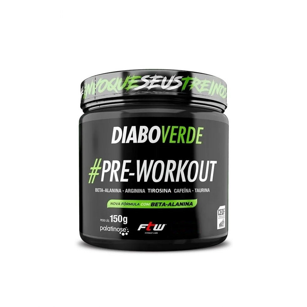 Diabo Verde Insano Pre-Workout (150g) - FTW Sports Nutriton --* SEU TREINO MUITO MAIS INSANO Deixe seu treino insano com um poderoso pré-workout com 200mg de cafeína. Em sua composição encontramos aminoácidos não essenciais como a alanina, a arginina e a taurina. Além de sua base, duas substâncias potentes: a cafeína, que auxilia no aumento da performance no desempenho de exercícios físicos de resistência, e a creatina que auxilia no aumento do desempenho físico durante exercícios repetidos de curta duração e alta intensidade. Compre com garantia de qualidade direto da fábrica. O que é o Diabo Verde Insano FTW? Cada substância escolhida para o Diabo Verde Insano FTW, foi pensada exclusivamente para o melhor desempenho das vias metabólicas do nosso organismo. Diabo Verde Insano FTW é a combinação perfeita para o seu treino! Como tomar o Diabo Verde Insano FTW? A melhor maneira de como consumir o Diabo Verde Insano FTW dependerá de cada caso. Por isso, é necessário consultar um profissional da saúde para acrescentar esse produto em sua rotina. Dessa forma irá depender da demanda do organismo de cada um. De qualquer forma em nossa embalagem recomendamos diluir 10g (2 medidas dosadoras) em 1 copo contendo 200ml de água gelada ou suco de preferência. BENEFÍCIOS:* Força e Disposição para treinos mais duradouros;* Maior vasodilatação dos vasos sanguíneos; * Acelera o crescimento muscular;* Aumento prolongado da energia;