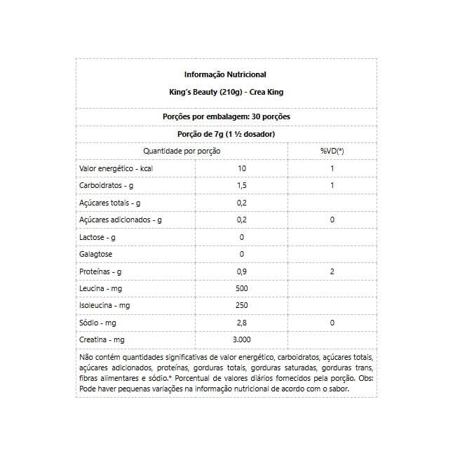 King´s Beauty (210g) King’s Beauty da Crea King é um suplemento inovador que combina creatina, colágeno e BCAA em uma fórmula única voltada para quem busca otimizar a performance, melhorar a recuperação muscular e promover saúde e beleza da pele, unhas e cabelos. Com o delicioso sabor de frutas vermelhas, King’s Beauty é ideal para treinos intensos e para quem deseja benefícios estéticos integrados ao suporte muscular. Principais Ingredientes e Benefícios: Creatina Monohidratada (3g por dose): Essencial para aumento de força, energia e explosão muscular, a creatina é fundamental para quem busca intensificar o desempenho e melhorar a capacidade física em atividades de alta intensidade.Peptídeos Bioativos de Colágeno Hidrolisado (1g por dose): Com peso molecular médio de 2kDa, estes peptídeos são altamente biodisponíveis e atuam na promoção da elasticidade e firmeza da pele, além de auxiliar na saúde das articulações, unhas e cabelos.BCAA (1g por dose): Composto por 500mg de L-Leucina, 250mg de L-Isoleucina e 250mg de L-Valina, os aminoácidos de cadeia ramificada são essenciais para a recuperação muscular e a prevenção do catabolismo, contribuindo para a manutenção da massa magra. Benefícios: Desempenho aprimorado: A creatina auxilia na força e na explosão muscular para treinos mais intensos.Beleza de dentro para fora: Colágeno hidrolisado para suporte à pele, cabelos e unhas saudáveis.Recuperação muscular acelerada: BCAA para prevenir o catabolismo e promover uma recuperação mais rápida e eficaz.Sabor refrescante de frutas vermelhas: Um sabor agradável que torna o consumo diário prazeroso.