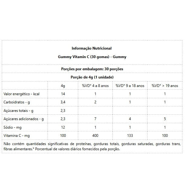 Gummy Vitamin C (30 gomas)  A sua imunidade mais forte que nunca. Gummy® A Original.      Gummy vai transformar a maneira como você consome vitaminas essenciais para a sua saúde. Gummy Vitamin C oferece uma dose diária de 250 mg de vitamina C, nutriente com alto poder antioxidante, que auxilia em diversos processos relacionados às defesas e à preservação do organismo. CONTRIBUI PARA O FUNCIONAMENTO DO SISTEMA IMUNE - O ácido ascórbico (vitamina C) possui propriedades antioxidantes que ajudam a aumentar a capacidade celular contra a ação de agentes infecciosos. AJUDA NA ABSORÇÃO DE FERRO DOS ALIMENTOS - A vitamina C ajuda a manter o ferro no estado favorável para a correta absorção no organismo, contribuindo para evitar a deficiência desse nutriente. FAVORECE O AUMENTO DA PRODUÇÃO DE COLÁGENO - A vitamina C é um micronutriente essencial para a formação dos vasos sanguíneos, uma ação corresponsável pela correta oxigenação da pele na formação do colágeno estrutural da pele. AUXILIA NO COMBATE AO ENVELHECIMENTO PRECOCE - A vitamina C auxilia na prevenção do envelhecimento causado pelo estresse oxidativo das células da pele, além de favorecer os processos de cicatrização.