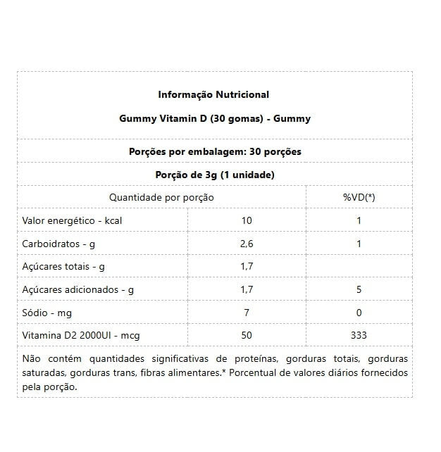 Gummy Vitamin D (30 gomas) A sua imunidade mais forte que nunca. Gummy® A Original. Em meio à agitação do dia a dia, a deficiência de vitamina D se torna cada vez mais comum. Gummy Vitamin D oferece uma dose diária de 2.000 UI de vitamina D, nutriente com alto poder antioxidante, que auxilia em diversos processos relacionados à imunidade, saúde óssea e muscular. CONTRIBUI PARA O FUNCIONAMENTO DO SISTEMA IMUNE - A vitamina D possui enzimas metabolizadoras que agem nas células do sistema imunológico, ajudando a manter sua performance contra doenças autoimunes, doenças alérgicas e infecções respiratórias. AJUDA NA SAÚDE ÓSSEA E MUSCULAR - A vitamina D é fundamental para a correta absorção de cálcio, o mineral estrutural dos ossos; estudos apontam também seus benefícios para o sistema de contração e força muscular. AUXILIA NA MANUTENÇÃO DA SAÚDE NEUROLÓGICA - A vitamina D possui diversas ações no sistema nervoso central, indicando o papel do hormônio no auxílio da manutenção das funções neuropsiquiátricas.