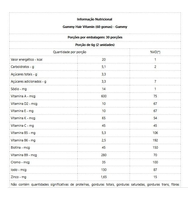 Promopacks Gummmy Hair Melancia (60 gomas) + Tutti Frutti (60 gomas) A gominha preferida das celebridades! Gummmy Hair Vitamin é a primeira vitamina em formato de coração do mundo e te oferece uma fórmula exclusiva que nutre, fortalece e acelera o crescimento dos cabelos e das unhas, além de melhorar a saúde da pele e fortalecer o sistema imunológico. As gominhas contêm uma poderosa combinação de Biotina, Retinol e +10 nutrientes essenciais. É a escolha perfeita para quem busca saúde e beleza. Qual a melhor forma de consumir Gummmy Hair Vitamin? Recomendamos a ingestão de 2 gominhas de Gummmy Hair Vitamin todos os dias, no horário de sua preferência, para obter os benefícios dos nutrientes da fórmula. É fácil lembrar da sua dose diária com uma gominha tão prática e deliciosa! A ciência dos ativos do Gummmy Hair Vitamin * Retinol - Popularmente conhecido como vitamina A, o retinol contribui para a manutenção da pele e auxilia no processo de diferenciação celular. * Vitamina C - Além de colaborar para o bom funcionamento do sistema imune, auxilia na proteção dos danos oxidativos causados pelos radicais livres. * Ácido Fólico - Também chamado de Vitamina B9, auxilia na síntese de aminoácidos, na formação das células vermelhas do sangue e no funcionamento do sistema imune. * Biotina - Também conhecida como Vitamina B7, age na síntese da queratina e contribui para a manutenção de pele, cabelo e unhas. * Zinco - Mineral essencial para o organismo humano, contribui para a manutenção do cabelo, da pele e das unhas, além de auxiliar no funcionamento do sistema imune. Benefícios: - Favorece o aumento da produção de colágeno - Também conhecido como vitamina A, o retinol age nos processos de renovação celular e produção de colágeno, ajudando a preencher as rugas e diminuir a hiperpigmentação. - Contribui para a prevenção de sinais do envelhecimento precoce - A vitamina C é um antioxidante que auxilia na proteção dos danos causados pelos radicais livres, responsáveis pelo aparecimento de rugas e outros desequilíbrios da pele. - Ajuda a manter a saúde de cabelo, pele e unhas - A biotina e o zinco participam da produção de queratina e ceramidas, que favorecem o crescimento saudável de cabelos e unhas, e colaboram com a saúde da barreira de proteção da pele. - Colabora para o funcionamento do sistema imune - O ácido fólico atua em vários processos do organismo, entre eles a divisão celular e a produção de células vermelhas do sangue, contribuindo para a boa performance das defesas do corpo.