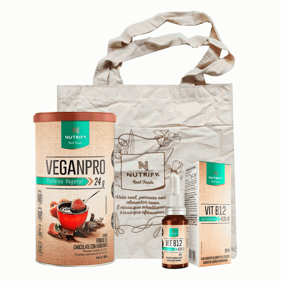 Combo Vegan - Nutrify composição do combo:1 - VeganPro (550g)1 - Vit B12 (20 ml)1 - Ecobag Nutrify (Algodão) sobre os produtos: ** O VeganPro Nutrify é um suplemento especialmente desenvolvido para fornecer um rico aporte proteico, ofertando 4,5 g de BCAA em cada porção e adicionado de fibras que auxiliam na saúde intestinal. Este superalimento é isento de lactose, glúten, adoçantes, conservantes artificiais e possui baixo teor de sódio, além de ser rico em vitamina B12, nutriente importante em dietas vegetarianas e veganas. ** A VITAMINA B12 é importante para o bom funcionamento de diversos processos em nosso organismo, entre eles: a formação de células vermelhas do sangue e o funcionamento do sistema imune. VITAMINA B12 NUTRIFY oferta o nutriente em sua forma natural, a metilcobalamina. Cada dose (1 gota) fornece 413% da indicação diária de vitamina B12 para adultos saudáveis, tornando-se uma boa fonte suplementar para vegetarianos estritos ou indivíduos com necessidades aumentadas desse nutriente. Uma opção de Vitamina B12 em gotas, ideal para você personalizar a dose de acordo com a sua necessidade. ** A Ecobag de Algodão Nutrify é uma Sacola Retornável confeccionada para substituir o uso de sacolas plásticas em feiras, supermercados, sacolões, etc. Ecobag ou Eco bag é um termo em inglês que significa Sacola Ecológica, também conhecida popularmente como Sacola de Pano, Sacola de Tecido ou Sacola de Tela. A Ecobag é realmente muito ecológica e serve para economizar o excessivo uso de sacolas plásticas descartáveis que tanto prejudica nosso meio ambiente. Tamanho: 39 cm de altura X 42 cm de largura. Benefícios:* Promove melhora na composição corporal, saúde e na qualidade de vida;* Possui PROTEÍNA DE ERVILHA: Ótima fonte de leucina, aminoácido mais importante para a síntese proteica entre os BCAA;* Contém PROTEÍNA DE ARROZ: Proteína de fácil digestibilidade que ajuda a evitar a perda de massa magra;* Possui CHIA: Considerada um superalimento, é rica em proteínas, fibras, minerais e antioxidantes;* Contém VITAMINA B12: Vitamina essencial para a manutenção da saúde em dietas vegetarianas e veganas, que têm maior risco de deficiência desse nutriente;* Cada dose fornece 413% da indicação diária de vitamina B12 para adultos saudáveis;* Ideal para vegetarianos e veganos;* Auxilia na produção de mielina;* Auxilia no processo da produção de energia;* Combate a anemia;* Não contém glúten.