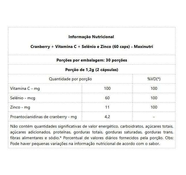 Cranberry + Vitamina C + Selênio e Zinco (60 caps) O Cranberry Maxinutri é um suplemento em cápsulas formulado a partir da fruta cranberry (Oxycoccus vaccinium), cuidadosamente processada para preservar ao máximo seus nutrientes essenciais. Com adição de Vitamina C, Selênio e Zinco, cada dose deste suplemento oferece 100% do Índice Diário Recomendado (IDR) desses nutrientes. O cranberry é amplamente reconhecido por promover a saúde do sistema urinário, graças à presença de proantocianidinas, compostos com ação antisséptica que ajudam a inibir a proliferação de bactérias no trato urinário. Além disso, o cranberry é rico em flavonoides, potentes antioxidantes que protegem o organismo dos danos causados pelos radicais livres, auxiliando na prevenção do envelhecimento precoce e no fortalecimento da saúde geral. Com o apoio da Vitamina C, do Selênio e do Zinco, o Cranberry Maxinutri intensifica sua ação antioxidante e oferece um reforço importante para o sistema imunológico, ajudando a manter o corpo protegido e fortalecido. Benefícios: * Suporte à saúde do sistema urinário;* Potente ação antioxidante;* Rico em vitaminas e minerais essenciais.