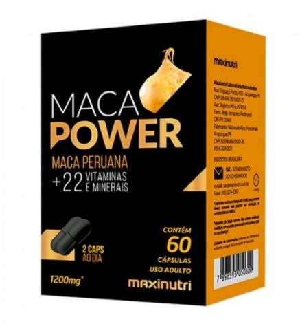 Maca Power 1200mg (60 caps) - Com Vitaminas e Minerais       Maca Power 1200mg Maxinutri é um suplemento composto por altor teor de Maca Peruana, 1200mg por porção, acrescido de 22 Vitaminas e Minerais.     A Maca Peruana é uma raiz de origem dos Andes, no Peru com tradição milenar, favorecendo assim um melhor desempenho energético. A Maca Peruana atua na disposição. Possui 22 Vitaminas e Minerais, auxiliam no melhor funcionamento do organismo como um todo, pois fornece vários nutrientes indispensáveis para manter uma boa saúde.   BENEFÍCIOS: - 22 vitaminas e minerais; -Supre 100% das necessidades diárias; - Melhor desempenho e vigor; - Importante para manter o bom funcionamento do organismo.