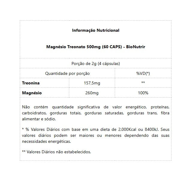 Magnésio Treonato 500mg (60 cápsulas)         O Magnésio Treonato é um suplemento capaz de melhorar a função do cérebro aumentando as funções cognitivas, ele fornece minerais adequados no cérebro para que ocorra um bom funcionamento na concentração e no aprendizado. A falta desse magnésio no nosso organismo pode interferir na qualidade de vida trazendo muitos prejuízos à saúde como confusão mental depressão, insônia, irritabilidade, desânimo, cansaço, perda de memória. Benefícios:   * Melhora a concentração;* Aumenta a disposição física;* Trata a ansiedade e estresse;* Auxilia na prevenção e no tratamento do Alzheimer;* Contribui na absorção do Cálcio do organismo;* Melhora a qualidade do sono.
