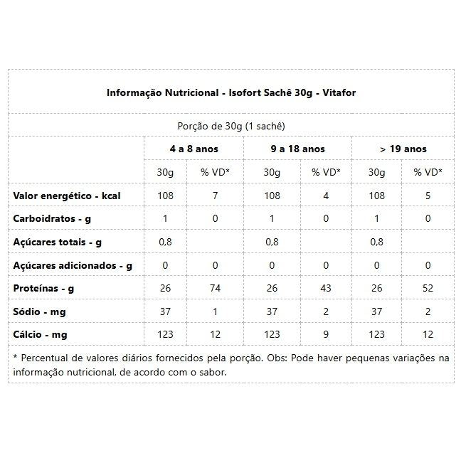 Isofort Sachê Display (15 sachês 30g) Proteína premium Maior aporte proteico na alimentação para auxílio na formação muscular1 ISOFORT® traz em sua fórmula a proteína isolada, diminuindo da formulação concentrações de carboidratos e permitindo mais rápida absorção da proteína pelo corpo humano. O ingrediente proteína do soro de leite (Whey Protein) é fonte de proteína, nutriente esse que auxilia na formação dos músculos e ossos. Desenvolvido por um sistema inteligente de distribuição de proteína isolada e parcialmente hidrolisada do soro de leite (WPI) de excepcional qualidade e de elevada concentração (92%), o qual emprega uma tecnologia exclusiva de extração de proteína, proporcionando assim, o melhor da proteína Isolada com excelente digestibilidade e máxima absorção de nutrientes. Isofort possui em sua formulação a proteína isolado do soro do leite. Cada dose recomendada (30g), possui 26 gramas de proteína, sendo 6g de glutamina e 5g de BCAA. Benefícios: - Whey Protein Isolate Premium;- Proteína de rápida absorção e alto valor biológico;- 5g de L-Glutamina em 30g;- 6g de BCAA em 30g;- Indicado para crianças (a partir de 4 anos) e adultos;- Extraído por elevado grau tecnológico por ultrafiltração, microfiltração e nanofiltração;- Alta concentração proteica - 92% de proteína nos sabores: Neutro, Baunilha, Chocolate e Frutas Vermelhas;- Zero açúcar;- Selo de Qualidade VLabor.