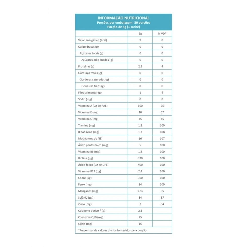 Colágeno Hidrolisado 2 em 1 VERISOL + Q10 (30 Sachês de 5g)        O Colágeno Hidrolisado 2 em 1 VERISOL da Maxinutri agora possui Coenzima Q10, dessa forma colaborando ainda mais para prevenção do envelhecimento celular, mantendo a pele mais firme, diminuindo celulites e também contribuindo para o fortalecimento das unhas, articulações, cabelos e hidratação da pele e dos intestinos.        O colágeno deixa de ser produzido gradativamente à partir dos 30 anos, portanto sua suplementação se faz necessária para manter uma aparência mais jovem e com menos flacidez tecidual. Com o colágeno O Colágeno Hidrolisado 2 em 1 VERISOL você vai experimentar a sensação de uma pele mais jovem e um corpo mais firme.    Benefícios:* 2,5g de colágeno puro;* Biotina, ácido fólico, vitaminas e silício;* Cobre, selênio, zinco, manganês e coenzima Q10;* 17 vitaminas e minerais;* Garante maior coesão dos tecidos da pele;* Garante cabelos e unhas com maior força e brilho;* Fortalece as articulações;* Diminui as rugas;* Está relacionado com a prevenção do envelhecimento.