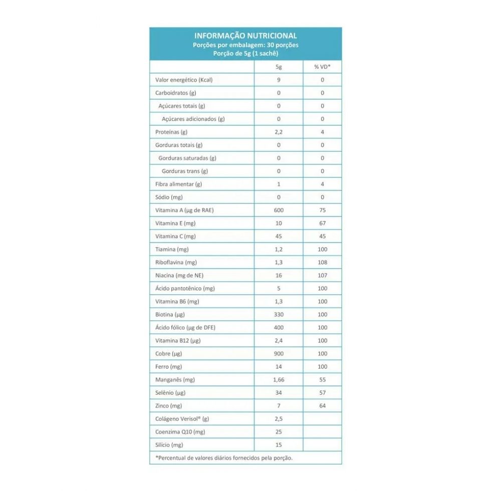Colágeno Hidrolisado 2 em 1 VERISOL + Q10 (30 Sachês de 5g)        O Colágeno Hidrolisado 2 em 1 VERISOL da Maxinutri agora possui Coenzima Q10, dessa forma colaborando ainda mais para prevenção do envelhecimento celular, mantendo a pele mais firme, diminuindo celulites e também contribuindo para o fortalecimento das unhas, articulações, cabelos e hidratação da pele e dos intestinos.        O colágeno deixa de ser produzido gradativamente à partir dos 30 anos, portanto sua suplementação se faz necessária para manter uma aparência mais jovem e com menos flacidez tecidual. Com o colágeno O Colágeno Hidrolisado 2 em 1 VERISOL você vai experimentar a sensação de uma pele mais jovem e um corpo mais firme.    Benefícios:* 2,5g de colágeno puro;* Biotina, ácido fólico, vitaminas e silício;* Cobre, selênio, zinco, manganês e coenzima Q10;* 17 vitaminas e minerais;* Garante maior coesão dos tecidos da pele;* Garante cabelos e unhas com maior força e brilho;* Fortalece as articulações;* Diminui as rugas;* Está relacionado com a prevenção do envelhecimento.