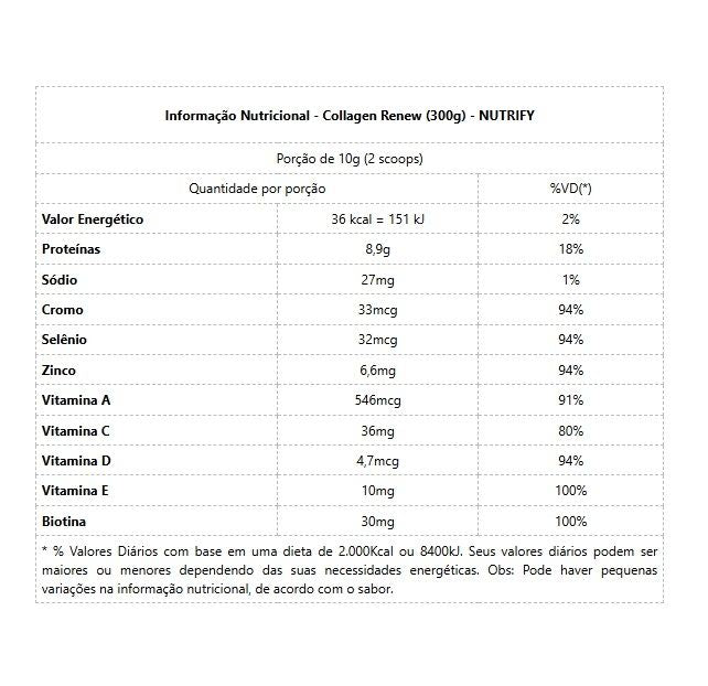 COLLAGEN RENEW VERISOL (300g) - NUTRIFY O Collagen Renew Nutrify contém peptídeos de colágeno acrescidos de 2,5 g de peptídeos bioativos de colágeno - VERISOL®. Esses peptídeos bioativos são obtidos por um processo tecnológico especial e patenteado, tornando-os específicos para estimular e restaurar o metabolismo das células dérmicas de dentro para fora. BENEFÍCIOS * Possui fórmula limpa, sem adição de açúcar, lactose, glúten, corantes e adoçantes artificiais;* Contém vitaminas e minerais antioxidantes que favorecem a absorção dos peptídeos bioativos de colágeno;* Promove o fortalecimento de pele, unhas e cabelo. Embalagem disponível: pote contendo suplemento em pó. Sabores: Limão, Laranja e Neutro. Peso líquido: 300g.