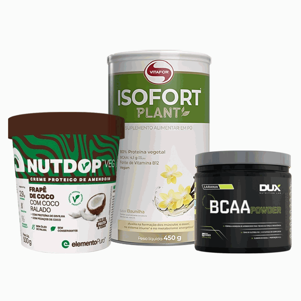 Combo Suplementos Naturais Composição do combo: 1 unid - Iso Fort Plant (450g) - VitaFor1 unid - BCAA Powder (200g) - Dux Nutrition1 unid - NutDop Creme de Amendoim (500g) - Elemento Puro Sobre os produtos: - ISOFORT PLANT é um suplemento alimentar plant-based (á base de plantas) composto por blend de proteínas vegetais: proteína isolada de ervilha e proteína de arroz, leucina e vitamina B12, com zero adição de açúcares. Possui alta concentração de proteínas, nutriente esse que auxilia na formação dos músculos e ossos, além de ser fonte de vitamina B12, nutriente esse que auxilia no funcionamento do sistema imune, no metabolismo energético, dos carboidratos, das proteínas e das gorduras. - O BCAA Powder da Dux Nutrition possui uma fórmula avançada à base de BCAAs na proporção 4:1:1 (quatro partes de Leucina, uma parte de Isoleucina e uma parte de Valina), aditivada com uma mistura excepcional de eletrólitos e complexo vitamínico, para entregar desempenho máximo em treinos e competições. A proteína, um dos três macronutrientes essenciais para o corpo, é formada por 20 aminoácidos, sendo que os 3 mais importantes (Leucina, Isoleucina e Valina) não são produzidos por nosso organismo. Eles auxiliam o atleta em treinos e competições, melhorando o desempenho, prevenindo o catabolismo muscular e estimulando a síntese proteica. - Fazer um creme proteico sem adição de açúcar, sem glúten e sem conservantes, com um sabor insanamente irresistível, não é tarefa fácil, mas alguém tinha que fazer. Por isso, criamos NUTDOP, o creme proteico da Elemento Puro feito com amendoins frescos e WHEYDOP. Uma mistura perfeita e equilibrada que passa por um processo especial de fabricação para você sentir um sabor sem igual a cada colherada. A textura cremosa e os sabores viciantes de NUTDOP vão deixar o seu dia a dia muito mais gostoso e saudável, seja comendo de colher, com frutas, tapioca ou com o que mais a sua imaginação permitir. NUTDOP também é vegano nos sabores Frapê de Coco e Chocolate Belga. SEM SEPARAÇÃO EXCESSIVA DE ÓLEO - NUTDOP VEG é um creme proteico de amendoim moído em temperatura regulada, por isso não apresenta a comum e excessiva separação de óleo em pastas de amendoim. NUTDOP VEG é um creme proteico da Elemento Puro feito com amendoins frescos e VEGDOP. Benefícios: - Whey com 80% de proteína vegetal;- Whey com vitamina B12 de origem vegetal;- Bcaae#039;s produzido com matéria-prima importada, vegetal e de grau farmacêutico;- Micronutrientes especificamente formulados para atuar no desempenho atlético, construção e proteção muscular;- Creme de amendoim sem adição de açúcar, sem glúten, sem conservante e sem óleo de palma;- Não contém substâncias ilícitas, conservantes ou qualquer outro ingrediente inferior;- Estimula a síntese de fibras musculares, gerando aumento da hipertrofia muscular.