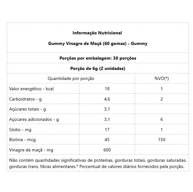 Gummmy Apple Cider Vinegar (60 gomas)  Experimente o poder do vinagre de maçã!      Já pensou no vinagre de maçã como um grande aliado da sua saúde? Estudos mostram que além de ajudar a reduzir a absorção de gorduras, esse ingrediente milenar contribui para uma maior sensação de saciedade e auxilia na manutenção de níveis saudáveis de colesterol. Gummmy Apple Cider Vinegar é uma forma prática, saborosa e segura de consumir diariamente os benefícios do vinagre de maçã.  Qual a melhor forma de consumir o Vinagre de Maçã?      O consumo do vinagre de maçã em sua forma pura tem ótimos benefícios, mas tem sabor desagradável e sua acidez pode causar danos ao estômago e aos dentes. O Gummy Apple Cider Vinegar é prático e delicioso: recomendamos ingerir diariamente 2 gominhas para obter o melhor do vinagre de maçã sem os efeitos colaterais da versão tradicional.   Benefícios: * Ajuda a reduzir a absorção de gorduras. Estudos mostram que o ácido acético presente no vinagre ajuda a inibir enzimas digestivas responsáveis pela quebra de carboidratos no intestino, reduzindo a quantidade de calorias absorvidas dos alimentos; * Ajuda a manter a saúde de cabelo, pele e unhas. A biotina participa da produção de queratina e ceramidas, que favorecem o crescimento saudável de cabelos e unhas, e colaboram com a saúde da barreira de proteção da pele; * Auxilia na manutenção de níveis saudáveis de colesterol. O vinagre de maçã colabora para reduzir os níveis de colesterol e triglicerídeos, fatores que favorecem a melhora da saúde vascular. * Favorece uma boa digestão. Por ser um ingrediente rico em fibras e ácidos, o vinagre de maçã facilita o processamento dos alimentos no trato digestivo, podendo diminuir sintomas como "estômago pesado" no período pós-refeição. * Contribui para uma maior sensação de saciedade. O vinagre de maçã contém fibras solúveis, como a pectina, que ajudam a prolongar a saciedade das refeições e reduzir a fome.