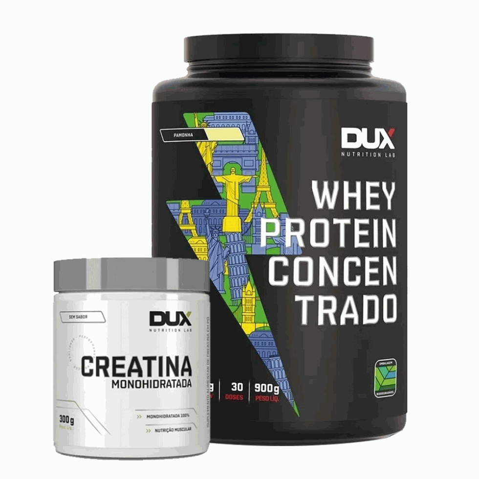 Kit Creatina + Whey Dux Nutrition Composição do combo:1 - Creatina Monohidratada (300g) - Dux Nutrition1 - Whey Protein Concentrado Pote (900g) - Dux Nutrition Sobre os produtos: ** A creatina monohidratada DUX é a escolha ideal para a nutrição diária dos músculos. 100% solúvel em água e sem adição de outros ingredientes. A creatina auxilia no aumento do desempenho físico durante exercícios repetidos de curta duração e alta intensidade. Creatina Monohidratada Dux® é feita sob controle de qualidade de excelência, para garantir rigorosamente a procedência e origem nobre do produto. Uma creatina livre de resíduos e substâncias indesejadas, como sulfatos, esteroides, DHT e DCD. ** O Whey Protein Concentrado Dux Nutriton é composto por proteínas de alto valor biológico e rápida absorção, além de gorduras essenciais, carboidratos e uma ampla gama de aminoácidos, fundamentais para garantir a síntese muscular acelerada após a prática de esportes. É ideal para ser consumido antes e depois de treinos, mas também pode fazer parte do café da manhã ou servir como um lanche entre as refeições, e em outros momentos conforme a orientação do seu nutricionista. Se há um nutriente indispensável, é a proteína. Ela é feita de aminoácidos, que são os blocos de construção do nosso corpo. A proteína do soro do leite, em inglês “Whey Protein”, é uma das fontes de aminoácidos de melhor absorção, maior até que o frango ou peixe. Isso torna o Whey uma forma conveniente de ingerir proteína, melhorando a saúde, o bem-estar e os resultados dos treinos. Benefícios: * Creatina livre de resíduos e substâncias indesejadas, como sulfatos, esteroides, DHT e DCD;* proporciona maior força muscular, resistência física, redução no tempo de recuperação, e aumento do volume muscular;* Matéria-prima Halal e Kosher, sem ingredientes inferiores, corantes, adoçantes artificiais, ou substâncias ilícitas;* Ideal para treinos de força ou com cargas, esportes de alto rendimento, de explosão e parada;* O nome diz tudo: Whey Protein Concentrado 100% puro, com transparência total, do nome do produto à lista de ingredientes;* Matéria-prima premium importada, com alto teor de leucina, desenvolvida para criar um produto com sabor real e marcante;* Valores nutricionais robustos, sem excessos, com quantidades ideais de carboidratos e gorduras do leite;* 20g de proteína;* Proteína moderna, desenvolvida por especialistas para atletas de esportes de performance (bodybuilding, crossfit e artes marciais), pessoas que buscam uma proteína com baixa caloria (para snacks fit e receitas sem culpa) e pessoas que buscam uma proteína ultrapura de altíssima qualidade.