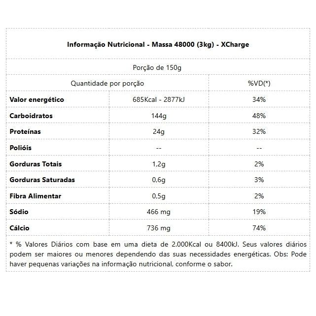 Massa 48000 (3kg) - XCharge       Os suplementos hipercalóricos são comuns entre os atletas e alunos de academias. E quem pega pesado nos treinos sabe que, para ganhar massa muscular, é preciso ter uma alimentação bastante regrada e rica em calorias para haver aumento significativo de peso - essencial para a hipertrofia.        Por esse motivo é recomendado o consumo de Massa 48000 da XCharge. Esse hipercalórico contém em sua composição um mix de proteínas obtidos através de whey protein concentrado e beef protein, glutamina, além de batata-doce em pó e creatina.        A creatina vai levar ao aumento da massa e da força muscular, dando maior aptidão física e pode contribuir para potencializar a saúde.  A batata-doce, por ter um índice glicêmico médio, te fornece energia de forma gradual para as atividades físicas, evitando quedas bruscas dos níveis de glicose e fadiga muscular, o que melhora o desempenho durante os treinos.       A Glutamina auxilia na redução de dor muscular e combate ao catabolismo. E o Whey fornece todos os aminoácidos não produzidos pelo organismo e é rico em BCAA — aminoácidos de cadeia ramificada (leucina, isoleucina e valina), importantes para a síntese (produção) de fibras musculares.       O consumo de Massa 48000 da XCharge traz vários benefícios e te ajuda a atingir seus objetivos de forma rápida, então não deixe para última hora, compre já o seu! Benefícios:* Auxilia no processo de hipertrofia; * Diminuição do catabolismo; * Melhora o desempenho;* Zero glúten;* Com Maxy Maize;* Contém Batata doce;* Contém Creatina;