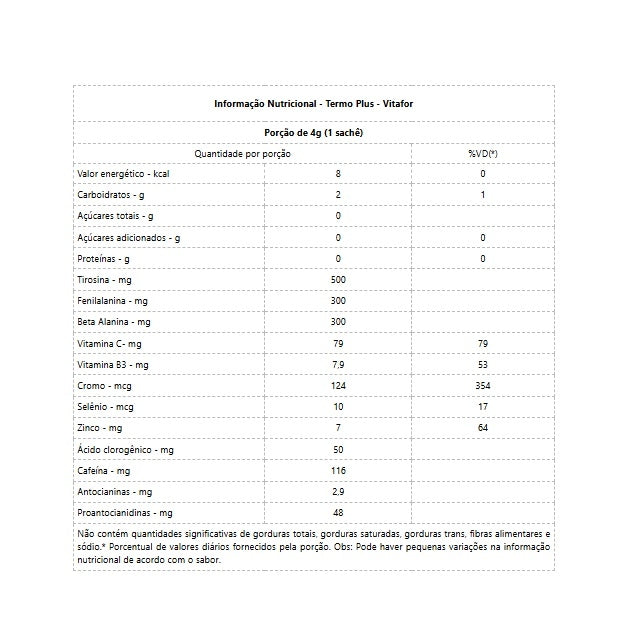 Termo Plus (240g) TERMO PLUS® é um suplemento alimentar à base de aminoácidos, vitaminas e minerais da Vitafor. A combinação de Laranja Moro, Café Verde, Ácido clorogênico e o Cromo agem em sinergia na fórmula, tornando ainda mais efetiva na melhora do desempenho, no metabolismo de proteínas, carboidratos e gorduras. Além de elementos termogênicos em sua formulação, TERMO PLUS ® é enriquecido com vitaminas e minerais, combatendo os radicais livres, que são precursores de doenças, e no metabolismo de nutrientes como proteínas, carboidratos e gorduras. Benefícios: - A vitamina C e a niacina (vitamina B3) auxiliam no metabolismo energético;- A vitamina C, o selênio e o zinco auxiliam no funcionamento do sistema imune;- A niacina contribui para a manutenção da pele e o zinco contribui para a manutenção do cabelo, da pele e das unhas;- A niacina, o cromo e o zinco auxiliam no metabolismo de proteínas, carboidratos e gorduras e a vitamina C auxilia no metabolismo de proteínas e gorduras;- A vitamina C e os minerais selênio e zinco são antioxidantes que auxiliam na proteção dos danos causados pelos radicais livres;- O zinco auxilia na visão, na síntese de proteínas e na manutenção de ossos. Diferenciais: - Cafeína naturalmente presente nos ingredientes, em quantidade aproximadamente 106 mg por porção;- Com ácido clorogênico, laranja moro e Cromo;- Fonte de aminoácidos, vitaminas e minerais;- Fácil solubilidade;- Selo de Qualidade VLabor